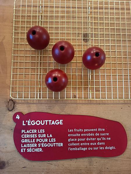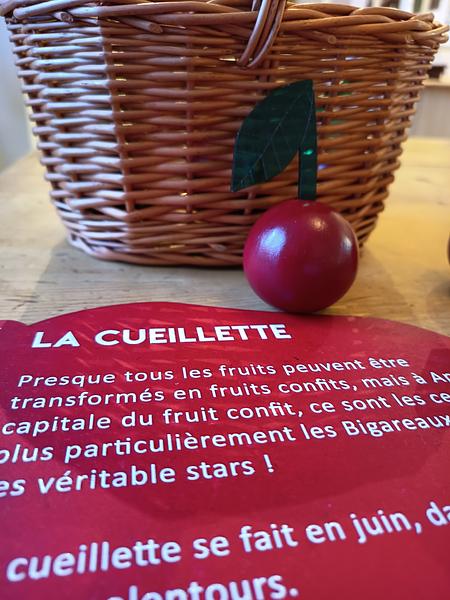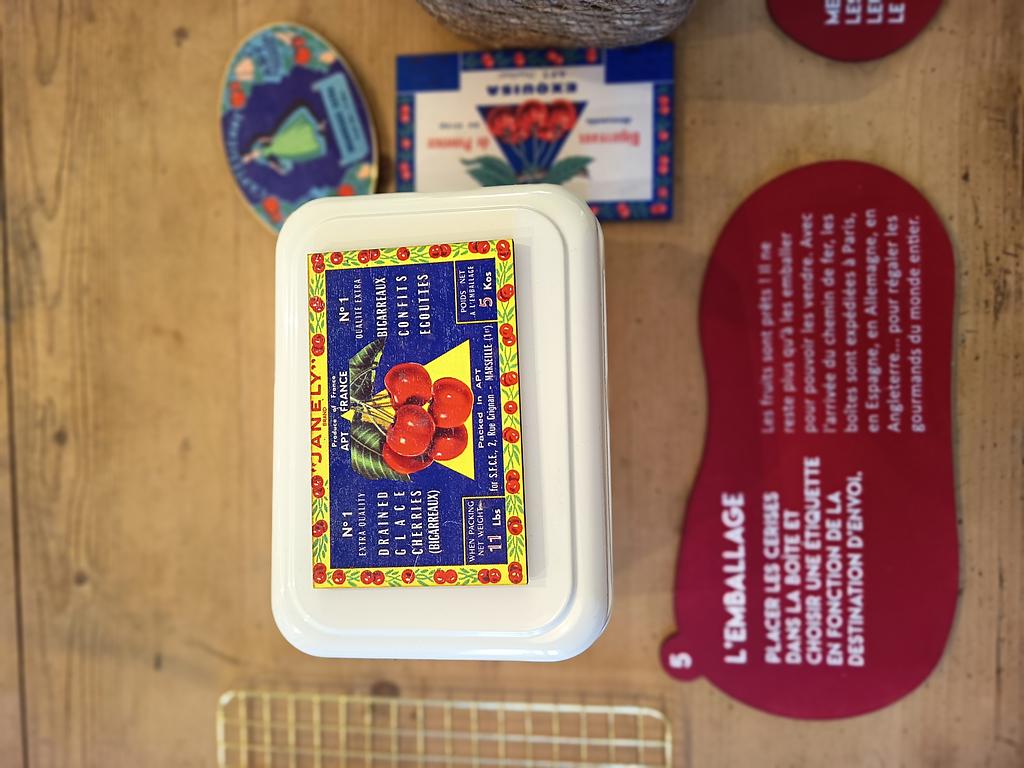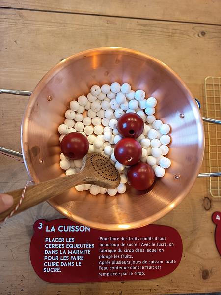 Pour rendre plus vivante la découverte du processus de la fabrication du fruit confit pour le public en famille, nous avons imaginer une dinette qui permet d'expérimenter les gestes de la cueillette à l'emballage des cerises confites, spécialités de la ville d'Apt.